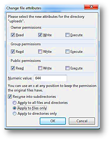 We must then follow the same procedure for the files. This time, though, we will select permission level 644, check the box for recursive directory scanning, and allow “apply to files only.”