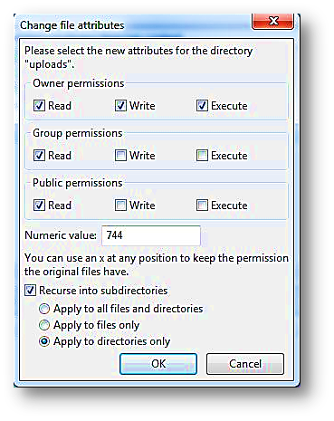 We will first set the permission level of the upload directory and all of its subfolders to 744. Enter this number into the area at the bottom to make this happen. Select “Apply to directories only” and “Recurse into subdirectories” from the options below.