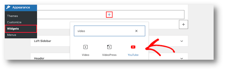• Simply click the “Plus” add block icon under Appearance » Widgets in your WordPress admin panel.