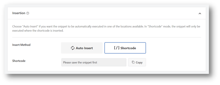 • You have the option to manually copy the code snippet from here and paste it anywhere on your website as a shortcode. A WordPress function can be chosen as the location where the code snippet will be automatically added, or you can use the “Auto Insert” option.