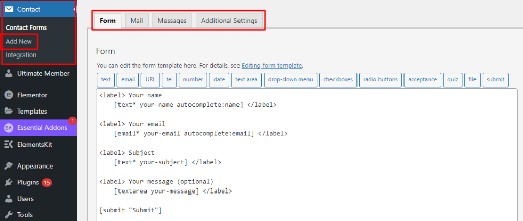 • Familiarize yourself with these tabs to navigate the plugin effectively. They include “Contact Forms”, “Integration”, “Mail”, “Messages”, “Additional Settings”, and “Tools.”