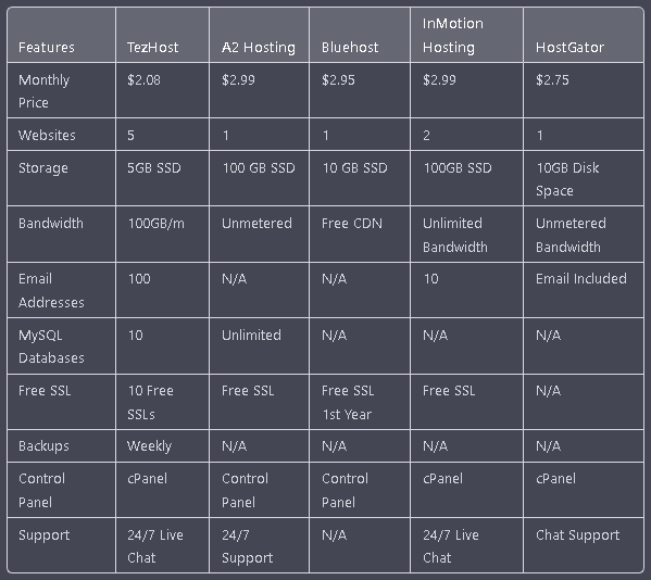 InMotion Hosting offers a higher number of websites and more storage compared to TezHost, but they come at a slightly higher cost. A2 Hosting and Bluehost, on the other hand, offer fewer features than TezHost at a similar price. In terms of support, all of these hosting providers offer 24/7 support. However, TezHost is known for its support.