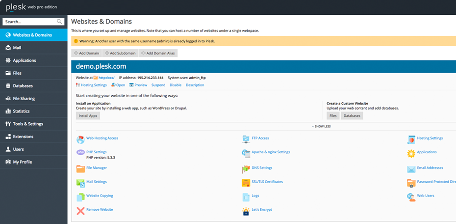 From one interface, Plesk lets you handle databases, manage several domains, change DNS settings, and most crucially, handle SSL certificates.